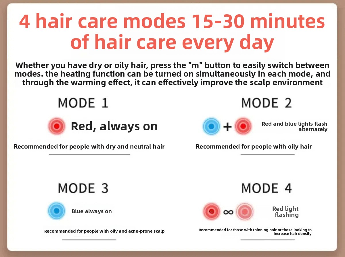 Thérapie par la lumière rouge et bleue : combinez la lumière rouge pour le rajeunissement du cuir chevelu et la lumière bleue pour les soins antibactériens.